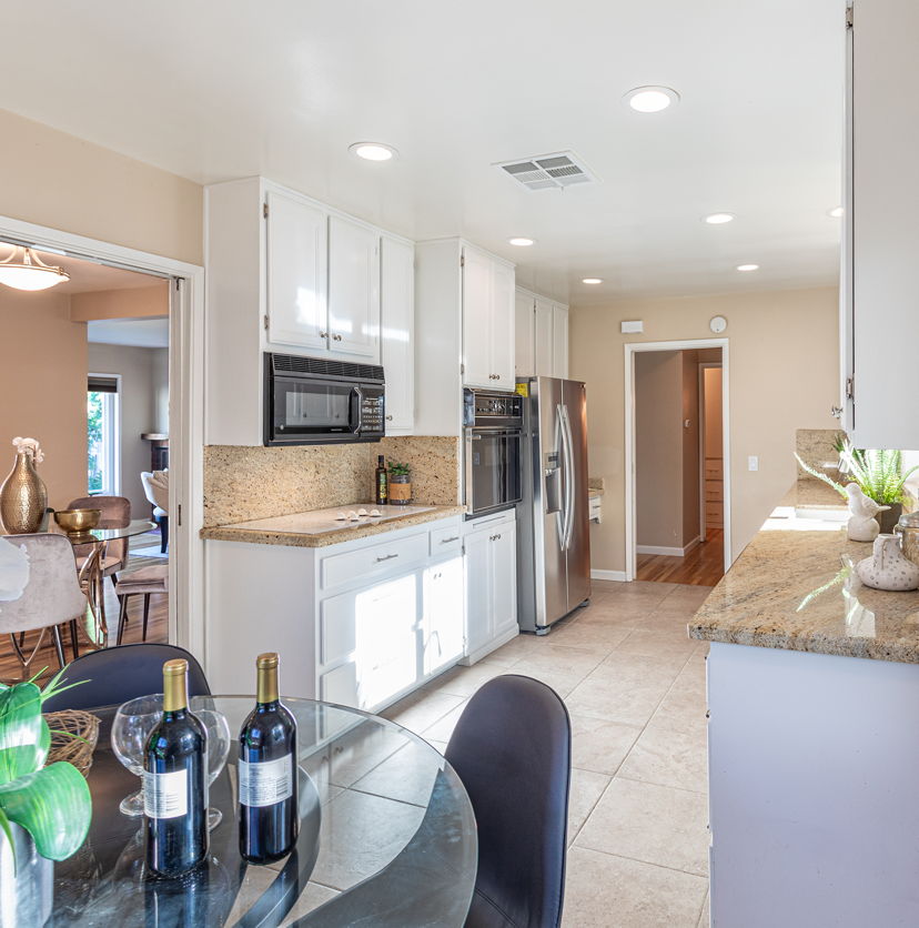 The two private bedroom suites offer a quiet retreat after long, hectic days. This first bedroom suite has plenty of closet space and door access to a large bathroom with a shower, separate bathtub, ceramic-tiled flooring, and a large single sink vanity. There is a large closet with custom shelving and storage as you enter the second bedroom suite. Walk past the closet into the sizable main bedroom space with a door leading to the back yard. This bedroom’s en-suite bathroom has a single sink vanity, tiled flooring, and a large glass enclosed subway tiled shower with frameless glass door, built-in seating, and a rain shower head.